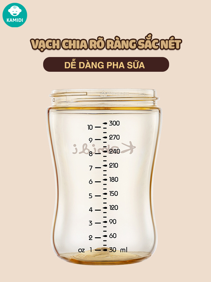 Bình sữa Kamidi nhựa PPSU với thân bình bằng nhựa PPSU cao cấp, cứng cáp, độ bền cao, thân bình trong suốt.