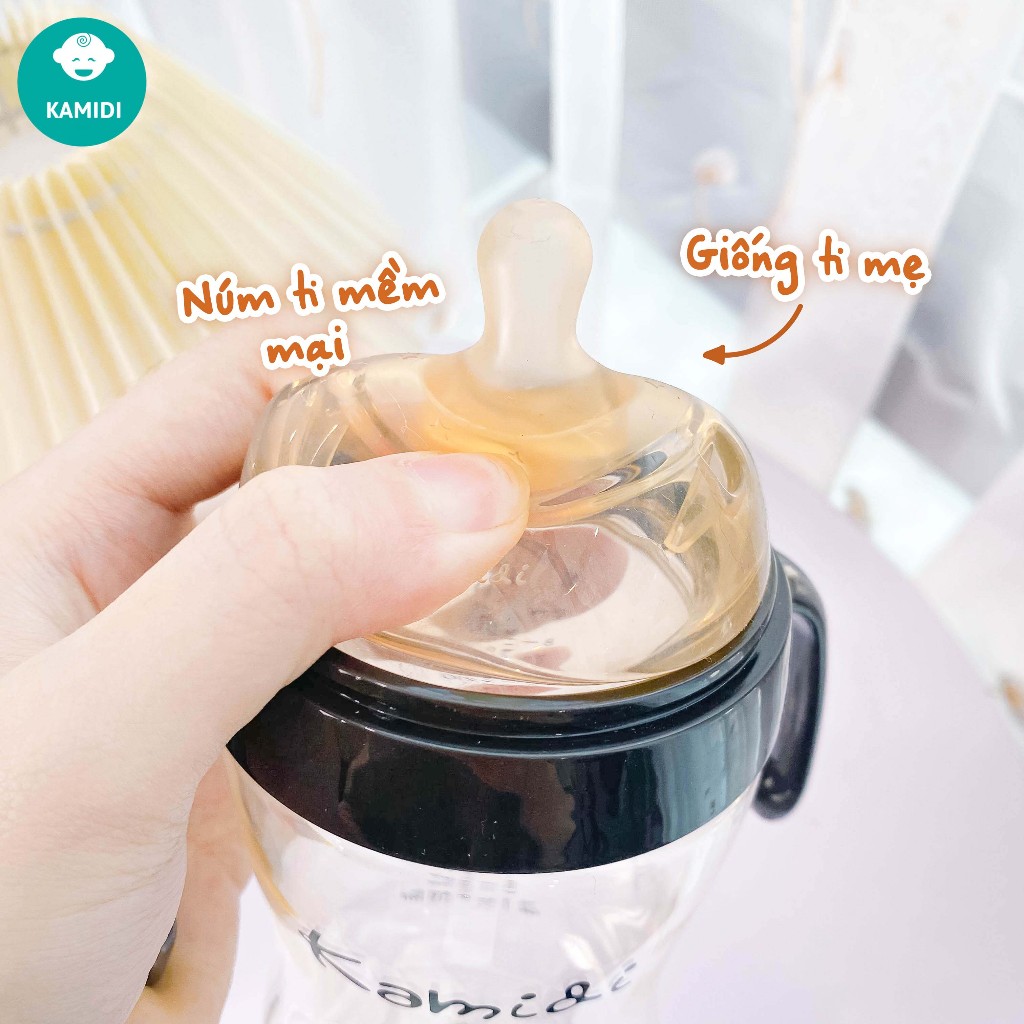 + Bình Kamidi Silicone 150ml: Núm đi kèm 1 tia dành cho bé từ 0 – 5 tháng, tốc độ chảy chậm.