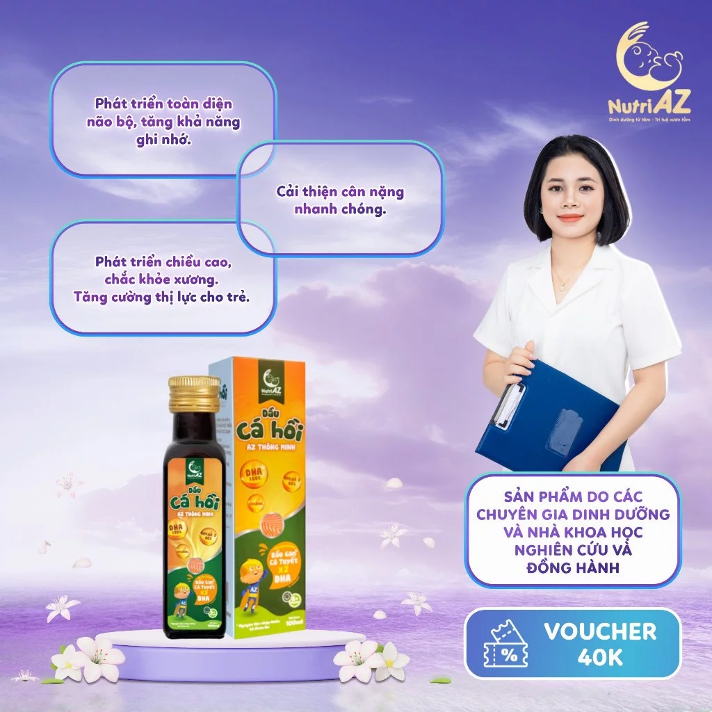 - Dầu ăn dặm cá hồi NutriAZ hỗ trợ tăng khả năng ghi nhớ và tập trung, hỗ trợ cải thiện cân nặng nhanh chóng và giúp trẻ phát triển chiều cao vượt trội