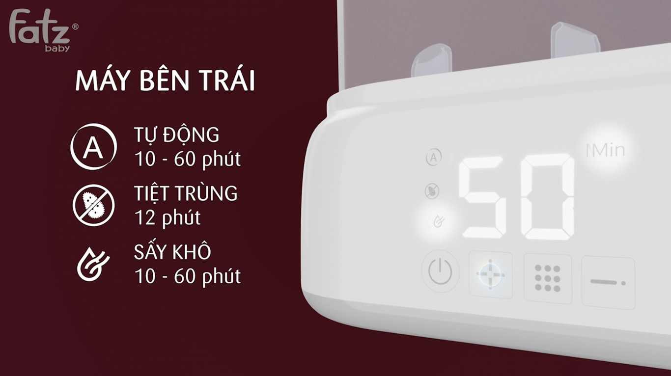 - Công suất máy bên trái: 500 W (tiệt trùng) + 115W (sấy khô);