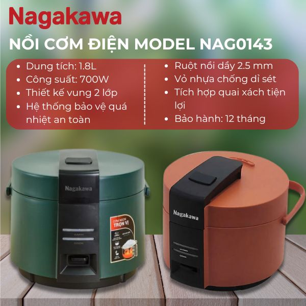 Trong nhịp sống hiện đại, nồi cơm điện không chỉ là thiết bị nấu nướng quen thuộc mà còn trở thành người bạn đồng hành không thể thiếu trong mỗi gian bếp Việt. Với nhu cầu ngày càng cao về sự tiện lợi, an toàn và chất lượng, các sản phẩm nồi cơm điện cũng ngày càng được cải tiến để phục vụ tốt hơn cho người tiêu dùng. Một trong những sản phẩm nổi bật hiện nay chính là Nồi cơm điện Nagakawa NAG0143 – dòng nồi có dung tích lớn 1.8L, thiết kế đẹp mắt, tay xách tiện lợi, tích hợp nhiều tính năng hiện đại giúp việc nấu cơm trở nên dễ dàng và nhanh chóng hơn bao giờ hết.